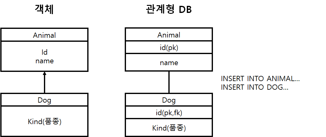 객체지향적으로 잘 설계 하였지만 관계형 데이터 베이스에 저장하기 위해서는 Animal에 insert, Dog에도 insert를 해야
