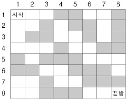 n×n 바둑판 모양으로 총 n2개의 방이 있다. 일부분은 검은 방이고 나머지는 모두 흰 방이다. 검은 방은 사면이 벽으로 싸여 있어 들어가 수 없다. 서로 붙어 있는 두 개의 흰 방 사이에는 문이 있어서 지나다닐 수 있다. 윗줄 맨 왼쪽 방은 시작방으로서 항상 흰 방이고, 아랫줄 맨 오른쪽 방은 끝방으로서 역시 흰 방이다.