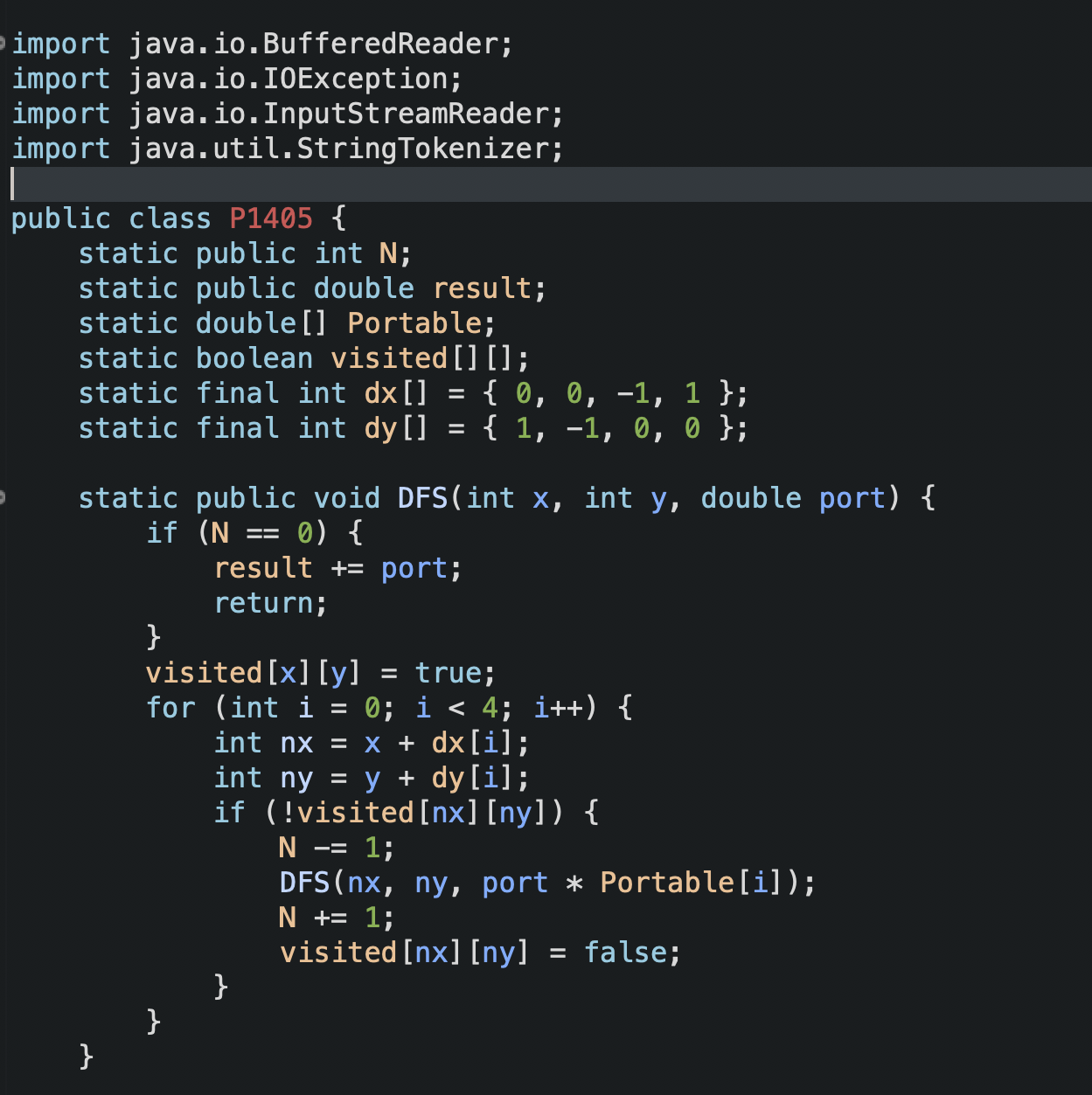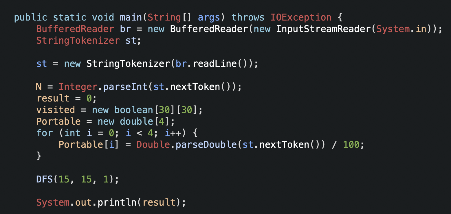 3. DFS(15,15,1) 15,15 는 DFS를 시작하는 지점이다. 1 은 누적 확률이다. 재귀함수를 수행할때마다 1 * Portable[x] 를 하여 확률이 갈수록 줄어들게 될것이다.
