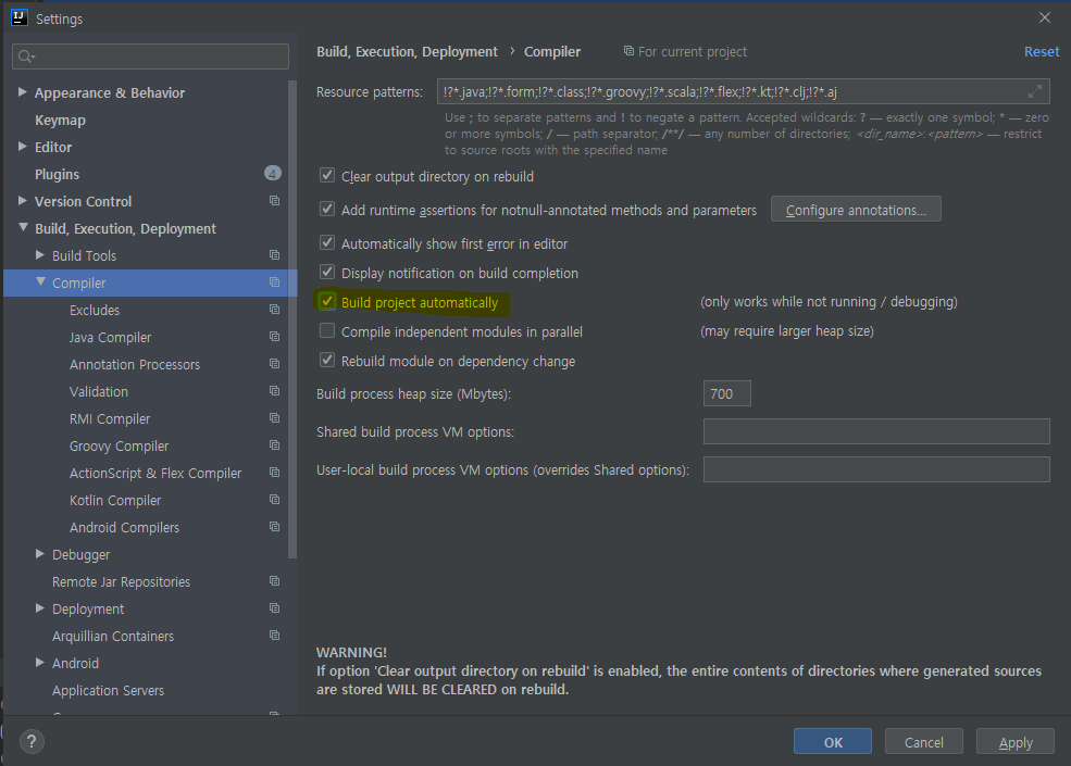 해당기능을 체크하면 spring boot 에서 코드 변경시 자동으로 빌드를 다시하게됩니다.