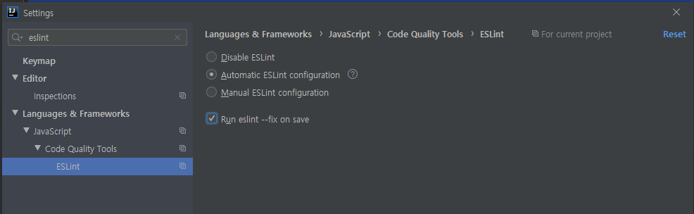 eslint를 검색하여 ctrl + s (저장) 을 누르면 자동으로 포맷을 맞춰주도록 Eslint를 셋팅해줍니다.