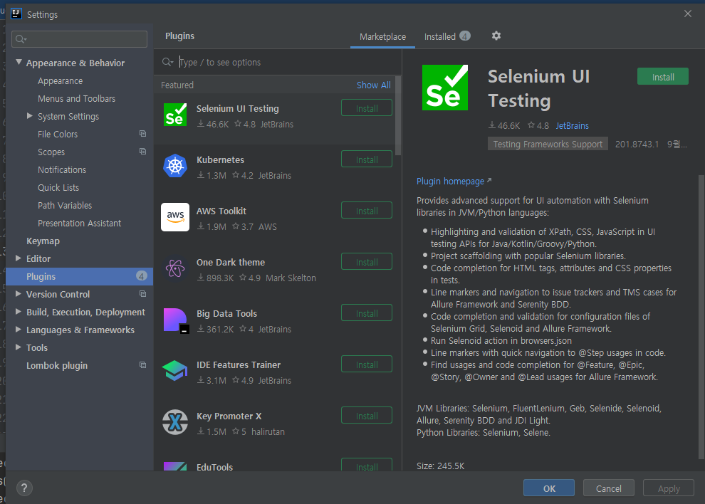 Intelij 메뉴에서 File > Setting > Plugins로 들어가면 아래와 같은 화면이 나오게됩니다.