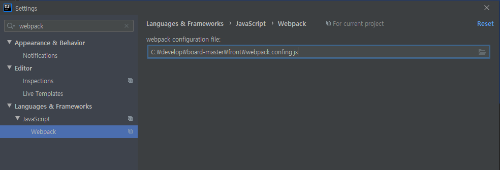 그러면 Intelij 에서 webpack 파일을 적용시켜보겠습니다. File > Settings로 들어가 webpack을 검색합니다.