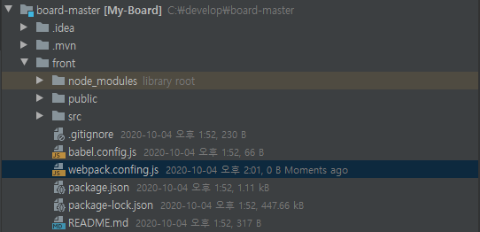 프로젝트 root > front 위치에 webpack.config.js 파일을 생성합니다.