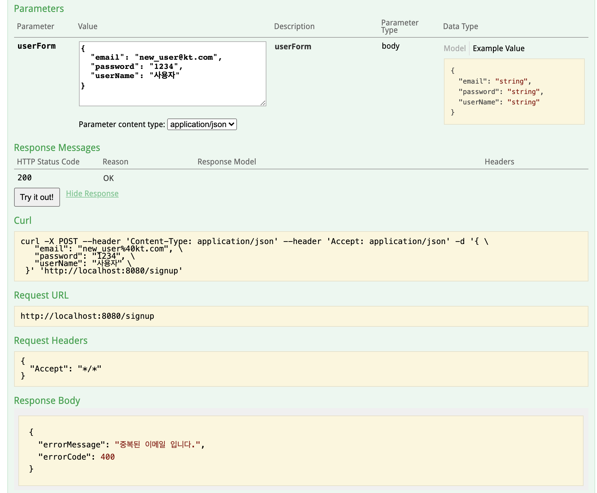 정보를 넣고 Try it out 을 누르면 처음에는 회원가입이 잘 되지만 한번 더 누르게되면 아래와 같이 에러코드를 볼 수 있습니다.