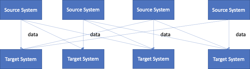 4개의 소스시스템과 6개의 타켓 시스템이 모두 연결되어 있다고 가정하면 4*6=24 개의 통합과정이 필요합니다.