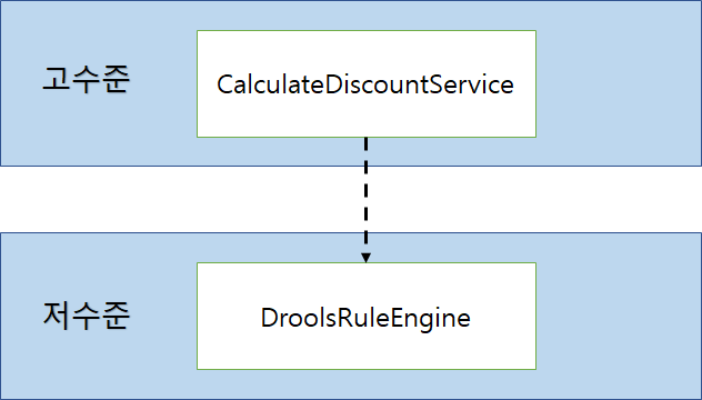 상품 도메인의 상황을 예시로 들어보겠습니다. 상품 도메인에서 할인 금액 계산 로직이 복잡해지면 객체지향적으로 로직을 구현하는 것 보다 룰엔진을 사용하는 것이 더 알맞을 때가 있습니다. 다음 코드는 CalcurateDiscountService(응용계층)가 Drools라는 룰엔진(인프라 계층)에 의존하는 상황입니다.