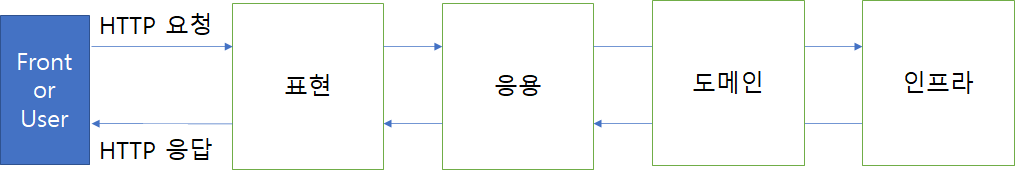 - 표현 계층은 흔히 Controller로 불립니다. 어플리케이션의 최상단에서 유저 또는 웹 요청을 받고 응용계층에 로직을 위임하고 적절한 응답을 합니다.