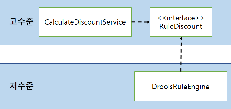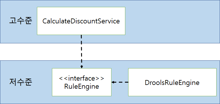 그림과 같은 의존 관계라면 DroolsRuleEngine에 변경이 발생한다면 CalculateDiscountService 또한 변경이 필수적으로 일어납니다. 따라서 고수준 모듈인 Service가 저수준 모듈인 RuleEngine에 의존 하고 있습니다.
